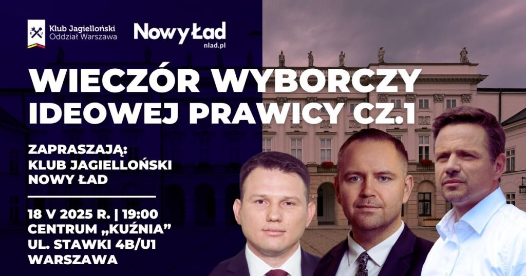 Już w najbliższą niedzielę 18 maja 2025 r. odbędzie się pierwsza tura wyborów prezydenckich w Polsce. Tego dnia Klub Jagielloński oraz Nowy Ład zapraszają na „Wieczór wyborczy ideowej prawicy” – wydarzenie, które będzie okazją do wspólnego śledzenia wyników głosowania, wymiany opinii oraz pogłębionej debaty o przyszłości kraju.