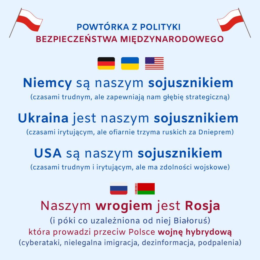 W ostatnim czasie po mediach społecznościowych krążyła grafika z buńczucznym tytułem Powtórka z polityki bezpieczeństwa międzynarodowego. Zawierała ona trzy tezy, z których szczególną uwagę poświęcić chcemy pierwszej: „Niemcy są naszym sojusznikiem (czasami trudnym, ale zapewniają nam głębię strategiczną)”. Rzeczona grafika miała jakoby przypominać to, co przecież, w rozumieniu jej autora, powinno być oczywiste, ale okazało się wymagać wytłumaczenia nieświadomym sytuacji międzynarodowej Polaków.