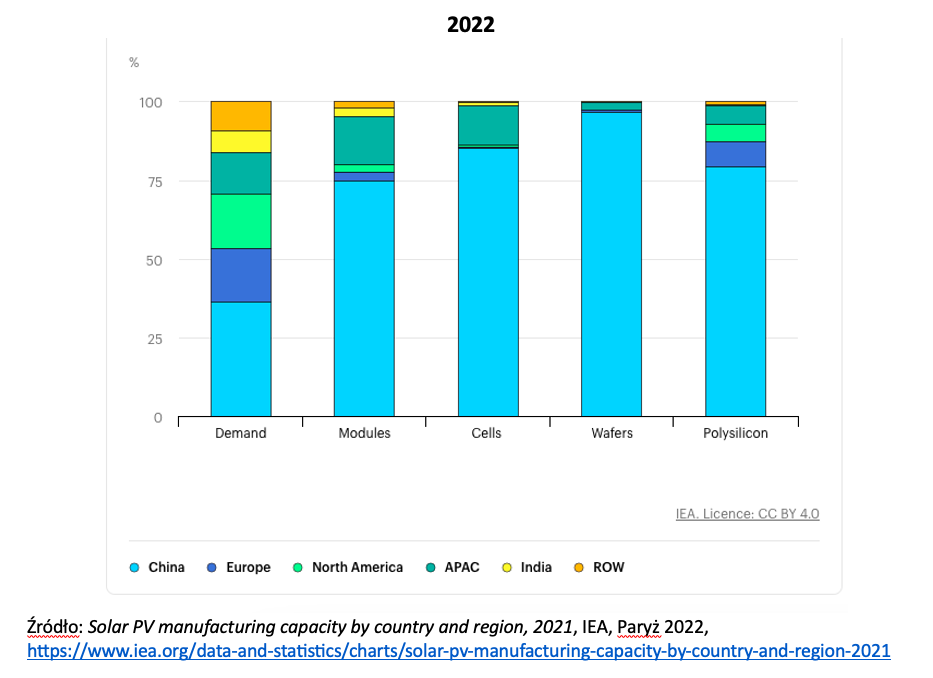 Największy, ponad trzykrotny wzrost udziału Chin w globalnej produkcji dotyczy polikrzemu. Biorąc pod uwagę planowane inwestycje, udział ten prawdopodobnie będzie się jeszcze zwiększał, aż do około 2027 r., kiedy szacuje się, że w wyniku rozbudowywania mocy produkcyjnych w innych państwach udział Chin może zacząć maleć. Nie zmienia to faktu, że Chiny pozostaną kluczowym producentem, bez którego transformacja energetyczna nie będzie możliwa.