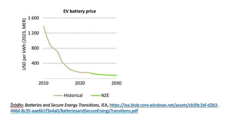 Sam rynek baterii dynamicznie rośnie. Noah Smith uważa wręcz, że lata 20. będą „dekadą baterii”[47]. W latach 2020-2023 moce produkcyjne zwiększyły się o około 300%. Międzynarodowa Agencja Energetyczna (IEA) szacuje, że (przy scenariuszu zakładającym osiągnięcie zeroemisyjności do 2050 r.) inwestycje w baterie wzrosną do około 800 mld dolarów w 2030 r., z czego większość inwestycji będzie skierowana do sektora pojazdów elektrycznych. Sama wielkość rynku wzrośnie czterokrotnie względem 2023 r. Choć udział Chin w rynku samochodów elektrycznych czy producentów baterii ulegnie zmniejszeniu, to wciąż pozostaną one kluczowym graczem, odpowiadając w 2030 r. za około 2/3 globalnych mocy produkcyjnych[48]. Rozwój tego rynku będą napędzać dynamiczne spadające ceny, a co za tym idzie, rosnąca dostępność. W latach 2010-2023 cena baterii spadła o 90% do około 140 dolarów za kilowatogodzinę. IEA szacuje, że do 2030 r. cena spadnie o kolejne 40%[49].