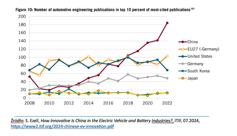 Stephen Ezell w raporcie How Innovative Is China in the Electric Vehicle and Battery Industries? wskazuje, że „w 2021 r. chińskie instytucje prześcignęły europejskie w 10% najczęściej cytowanych publikacji w inżynierii motoryzacyjnej. W 2012 r. chińskie instytucje opublikowały tylko około 26 takich artykułów z zakresu inżynierii motoryzacyjnej; do 2022 r. liczba ta wzrosła siedmiokrotnie, a chińskie instytucje opublikowały około 184 najczęściej cytowanych publikacji”[61].