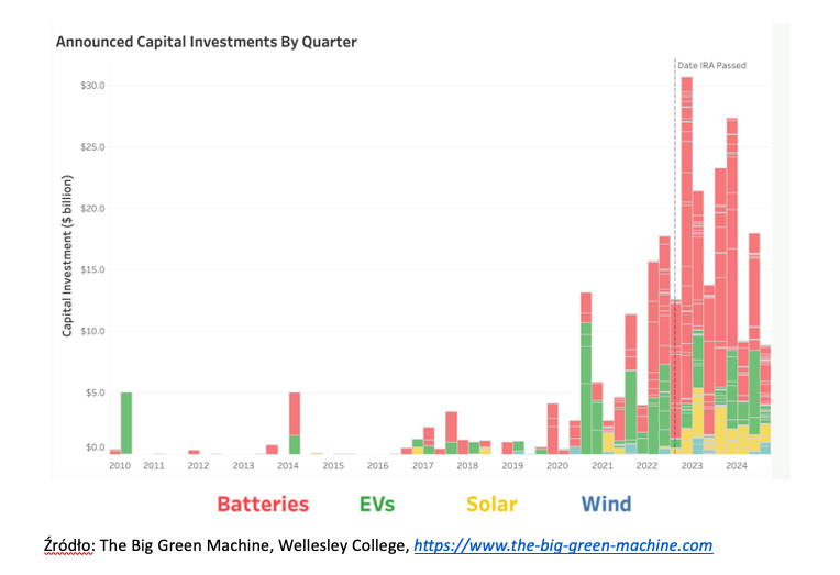 Poniższy wykres pochodzi ze strony The Big Green Machine, śledzącej inwestycje w łańcuch dostaw czystej energii w USA. Linią przerywaną na wykresie zaznaczono moment wejścia w życie IRA, kolor czerwony dotyczy inwestycji w przemysł bateryjny, zielony w pojazdy elektryczne, żółty fotowoltaikę, a niebieski energetykę wiatrową.
